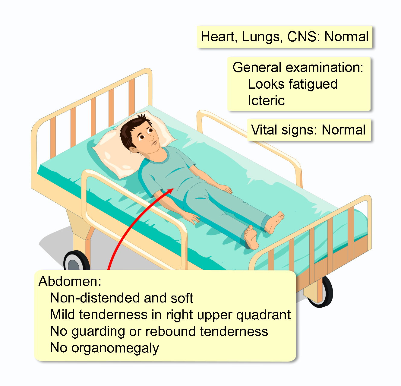 A 28-year-old man presents to the emergency department with a 5-day history of progressive malaise, anorexia, and nausea. For the past 2 days, he has also noted dark-colored urine and was told by his wife that his eyes appeared yellow. He works as a line cook and recently returned from a 10-day trip to Mexico 3 weeks ago, where he frequently consumed food and drinks from street vendors. His past medical history is unremarkable. He is not on any regular medications and denies use of supplements or over-the-counter drugs other than occasional acetaminophen for headaches, with his last dose over a month ago. He has no known allergies. He doesn’t recall if his childhood immunizations are up to date, and he did not attend any travel medicine consultation before traveling. He drinks alcohol socially (~2-3 drinks per week) and denies any intravenous or illicit drug use. He is in a monogamous relationship and denies any new sexual partners.
