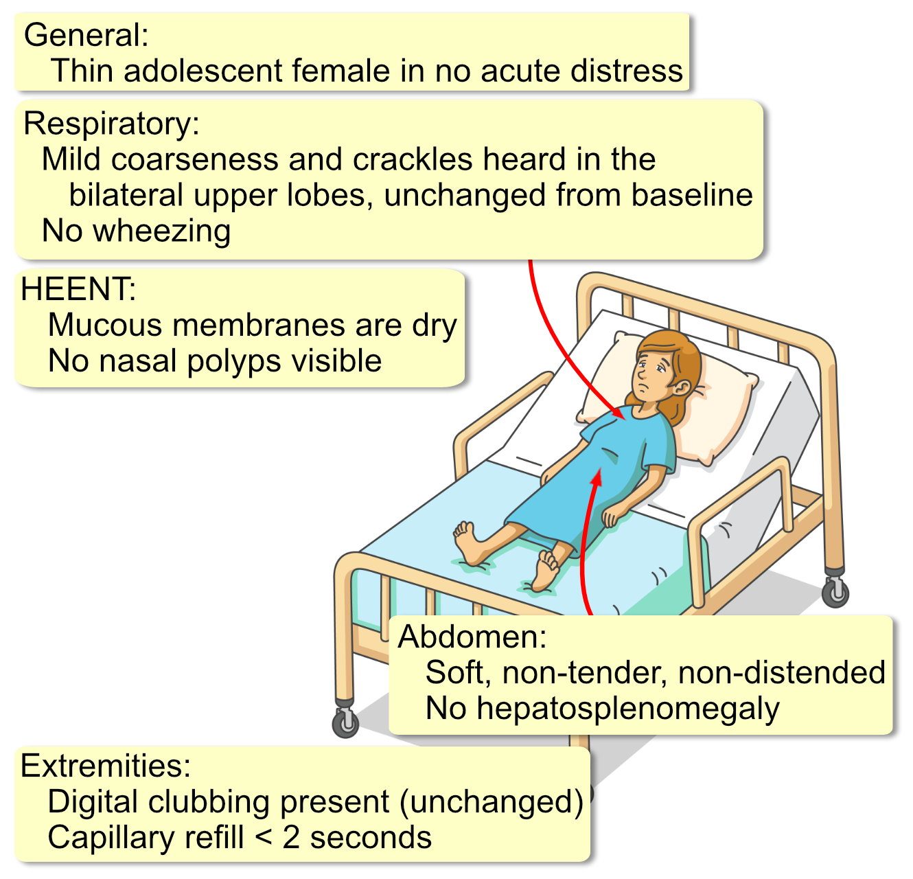A 16-year-old female with cystic fibrosis (homozygous F508del) presents to the CF clinic for a routine quarterly follow-up. She reports feeling more fatigued than usual over the past 3 months and has noted an unintentional weight loss of 8 lbs (3.6 kg) despite a voracious appetite. She admits to waking up twice a night to urinate and feeling constantly thirsty, which she attributes to the summer heat. She adheres to her airway clearance regimen and enzyme therapy. She denies fevers or acute changes in sputum production, though she feels her exercise tolerance has decreased. Her last pulmonary exacerbation treated with IV antibiotics was 14 months ago.
