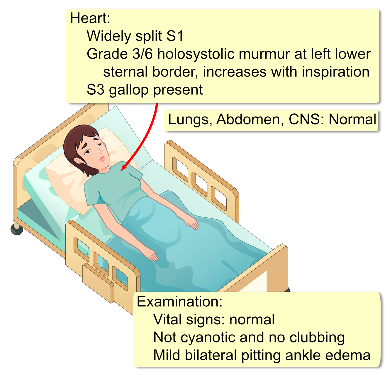 A 24-year-old woman presents to your office with a six-month history of progressive exertional dyspnea and intermittent palpitations. She was a competitive swimmer in high school but now finds she gets short of breath walking up two flights of stairs. The palpitations are described as a rapid, regular heartbeat lasting a few minutes and resolving spontaneously. She has not experienced syncope, presyncope, or chest pain. Her past medical history is notable for a heart murmur detected in childhood, which was considered “innocent” and did not prompt further investigation. She takes no medications and has no known allergies. Her family history is noncontributory for cardiac disease.