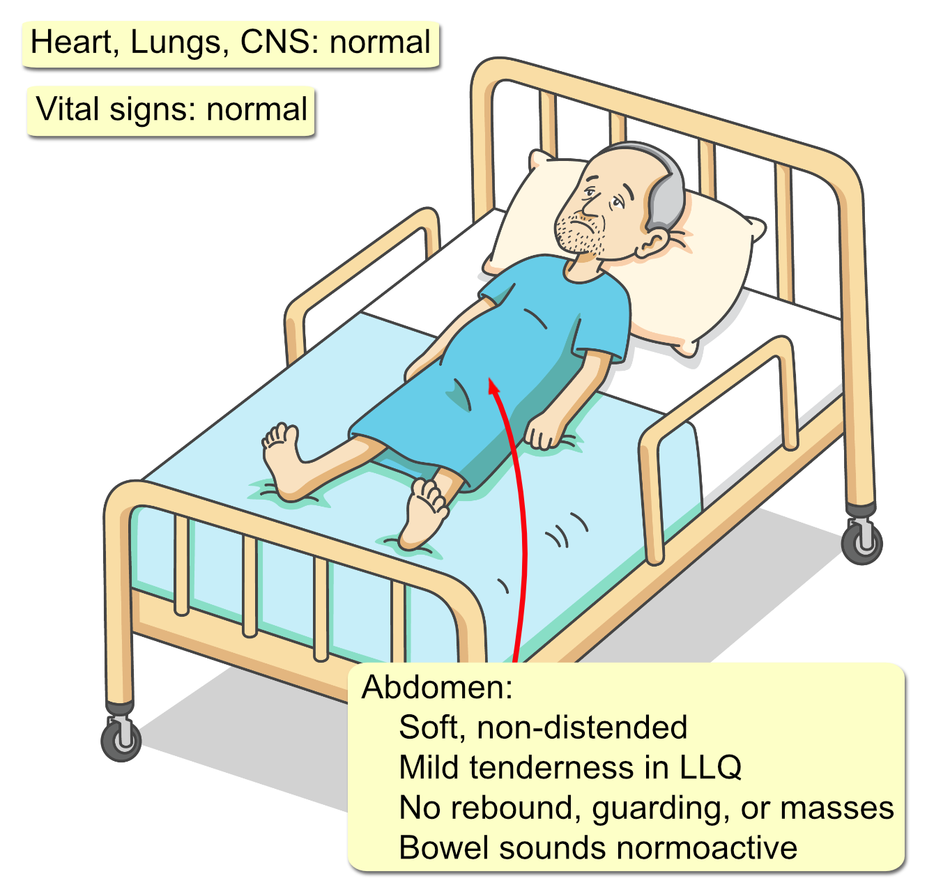 A 62-year-old man presents with a 6-month history of intermittent, crampy abdominal pain. The pain is localized to the left lower quadrant (LLQ). Episodes last for 1 to 2 days. They recur every few weeks. He notes the pain is not relieved by defecation. It is associated with significant bloating and an alternating pattern of bowel habits between diarrhea and constipation. He denies fever, chills, nausea, vomiting, or rectal bleeding. His last screening colonoscopy 3 years ago was normal except for diverticulosis in the sigmoid colon. His past medical history includes hypertension and obesity with a body mass index of 31 kg/m2. His diet is low in fiber. He consumes red meat frequently. He quit smoking 10 years ago. He is a social drinker.