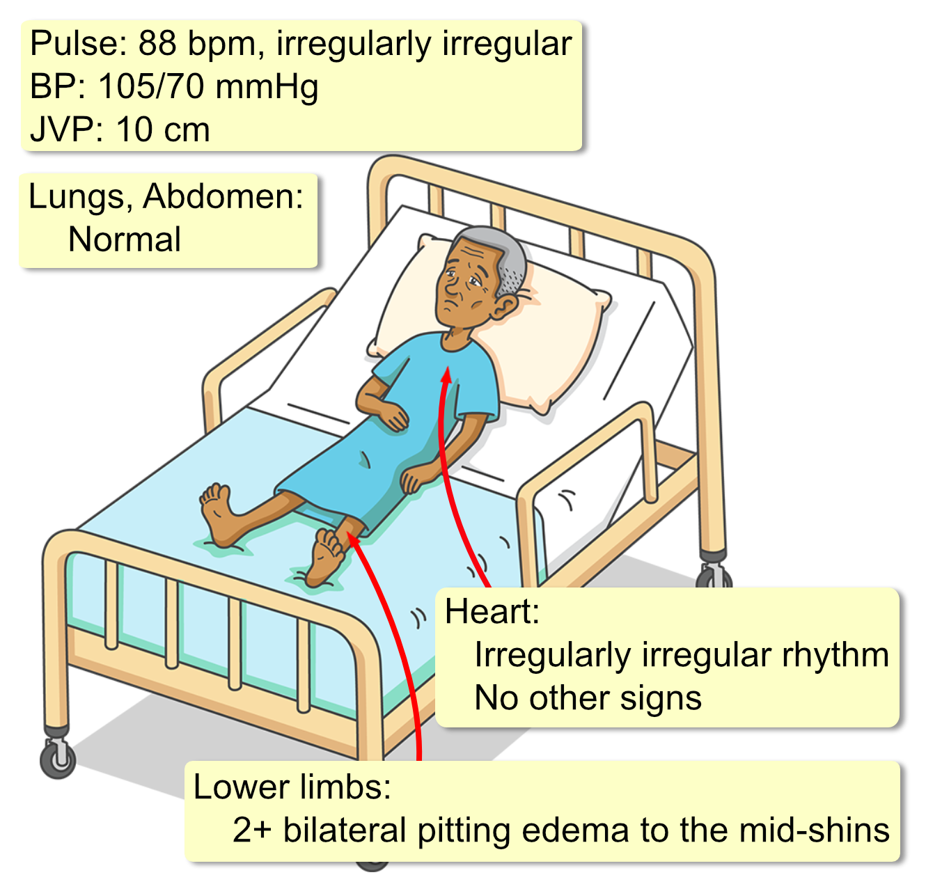 A 76-year-old African-American man presents with a one-year history of progressive shortness of breath with exertion and bilateral lower extremity swelling. He has also noticed increasing fatigue and episodes of lightheadedness, particularly when standing up. His medical history is notable for hypertension, bilateral carpal tunnel release 10 years prior, and a lumbar laminectomy for spinal stenosis 5 years ago. His hypertension was previously well-controlled on lisinopril, but he has had to reduce the dose due to low blood pressure readings at home. 12 lead ECG shows atrial fibrillation with a rate of 80 bpm, low voltages in the limb leads and poor R wave progression in the anterior leads.