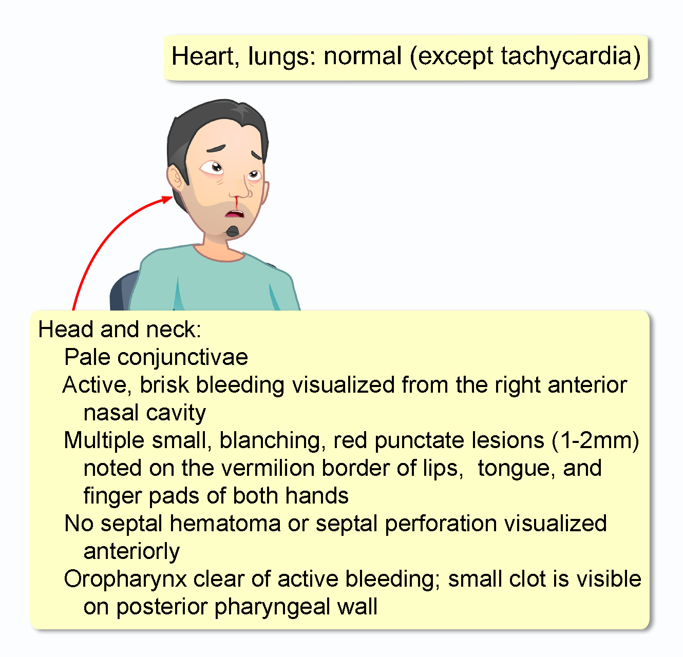 A 48-year-old man presents to the emergency department with a profuse nosebleed from the right nostril that began spontaneously 45 minutes ago. He reports attempting to pinch his nose at home for 15 minutes without success. This is his third episode of severe epistaxis this week, though the previous two resolved with compression. He reports a long history of recurrent nosebleeds since his teenage years, which have increased in frequency and severity over the last decade. He endorses feeling fatigued recently and notes shortness of breath upon climbing two flights of stairs. He denies any recent facial trauma, upper respiratory infection, or intranasal drug use. He is not currently taking anticoagulants or antiplatelet medications.