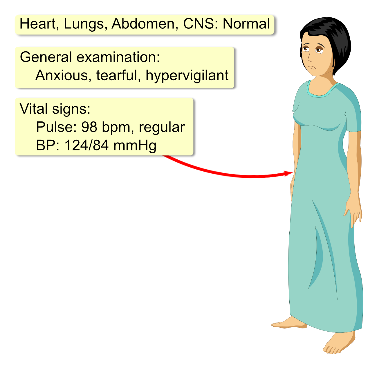 Her past medical history is unremarkable. She denies any prior psychiatric history, including anxiety or depression. She drinks one glass of wine on weekends and denies smoking or illicit drug use. She takes no regular medications.