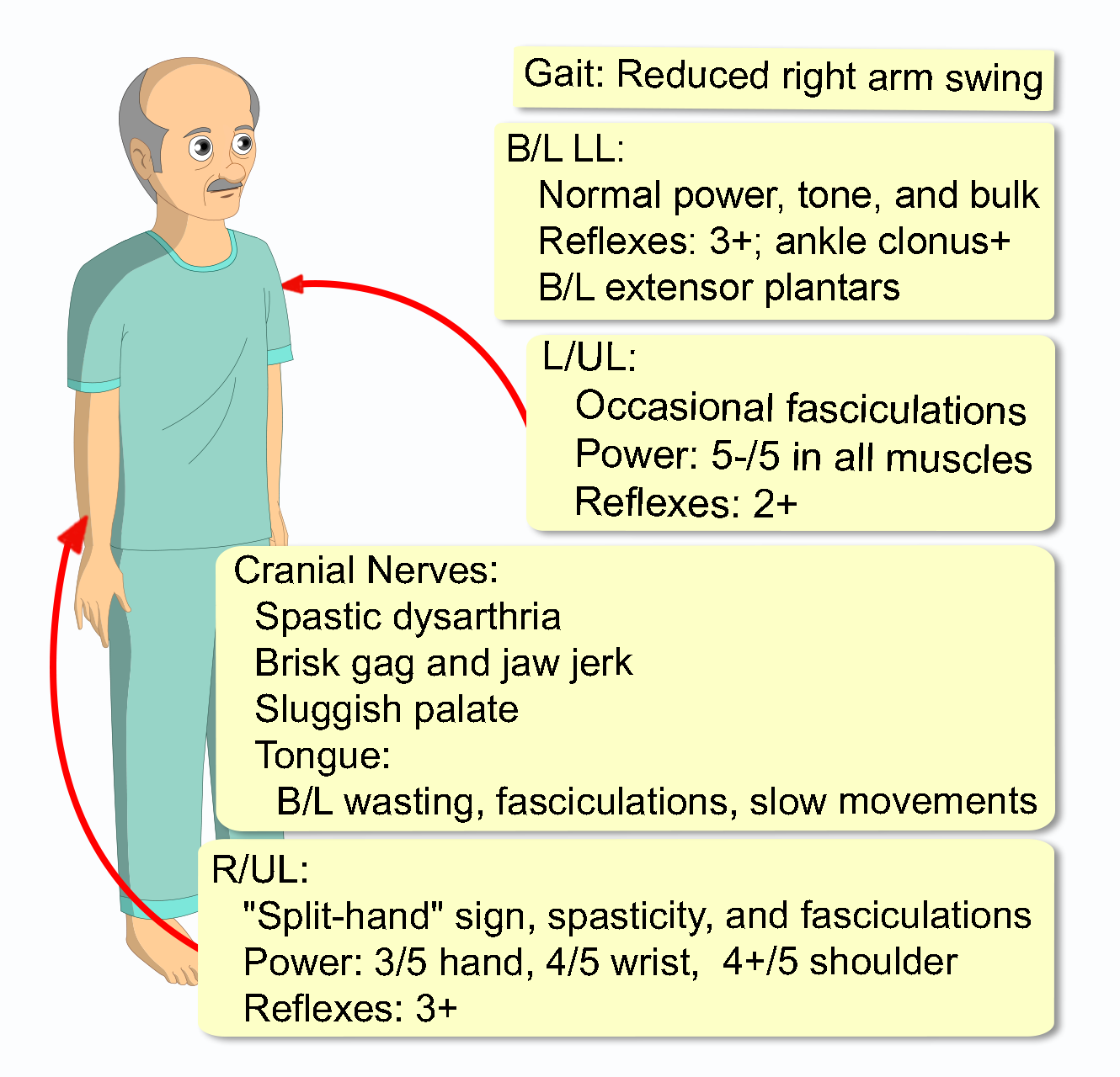 A 58-year-old right-handed man presents with a nine-month history of progressive weakness. It started subtly in his right hand. He noticed difficulty with fine motor tasks like buttoning his shirt and using keys. Over the last few months, the weakness has ascended to his right arm. He now struggles to lift a coffee mug. He has also observed constant muscle twitching in his right arm and shoulder. His wife notes that his speech has become slightly slurred, particularly when tired. He occasionally coughs on liquids. He denies any sensory changes, pain, bowel or bladder incontinence, or visual disturbances. His past medical history is unremarkable. He is not on any regular medications. He works as an accountant and has noticed his handwriting becoming nearly illegible. There is no family history of neurological disease.