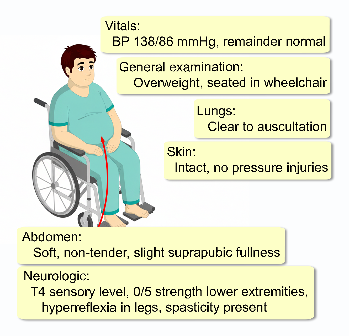 A 45-year-old man presents for an annual check-up 5 years after a traumatic T4 complete spinal cord injury (SCI). He reports worsening burning pain in his legs and lower abdomen, rating it 6/10. He also mentions gaining 15 lbs over the last year despite no change in diet. He denies fevers, chills, or acute respiratory symptoms but has a history of recurrent urinary tract infections. Current medications include baclofen and intermittent catheterization supplies. He is a former smoker (quit 5 years ago).