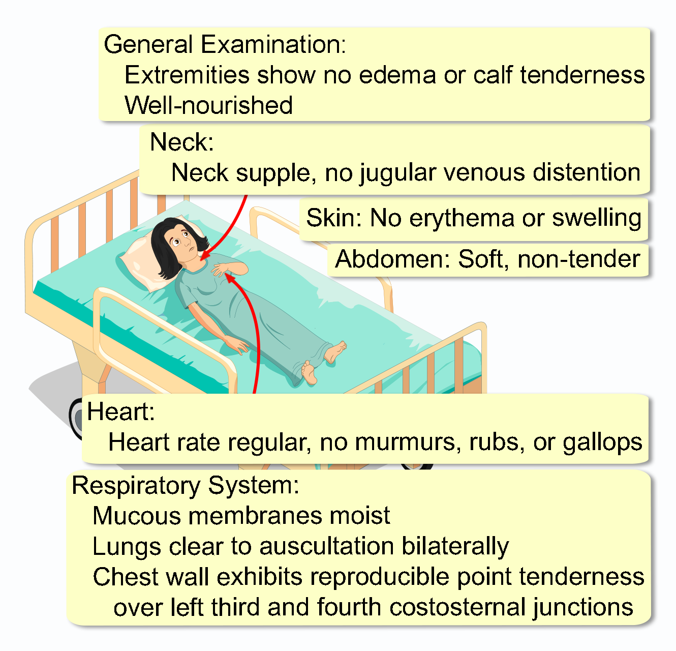 She appears comfortable at rest but winces with movement. She is afebrile. Her blood pressure is 128/76 mmHg with a heart rate of 78 bpm and oxygen saturation of 98% on room air.