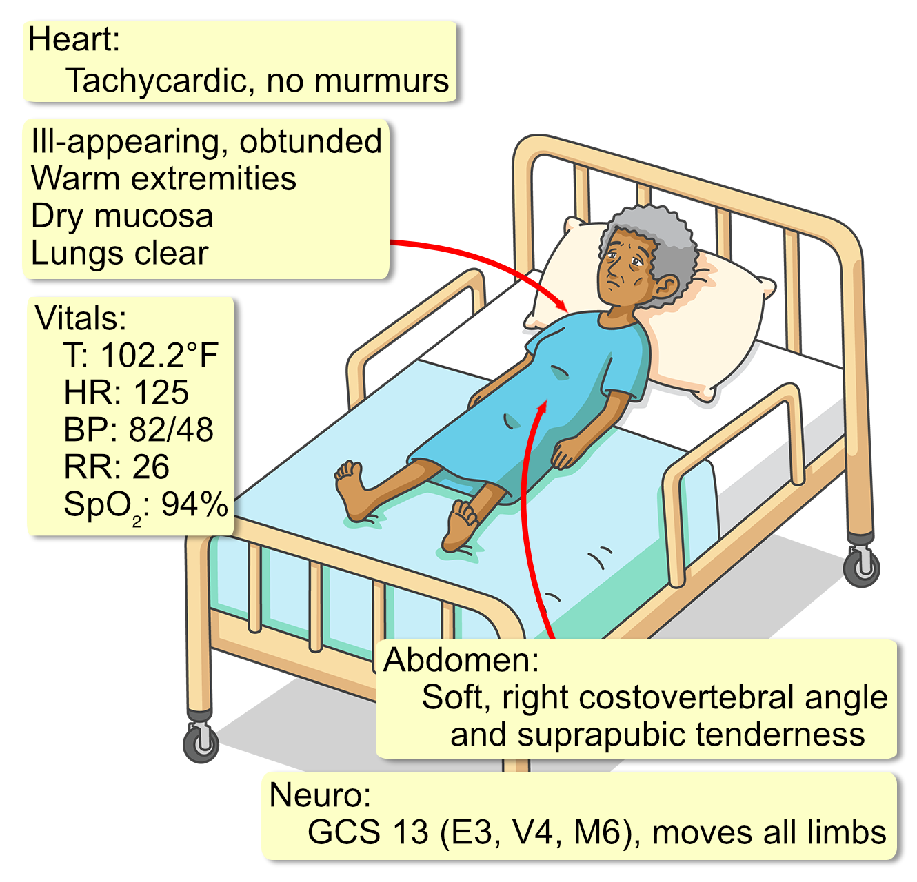 A 68-year-old female presents to the emergency department brought by her husband due to altered mental status and fever. The husband reports she has been complaining of dysuria and right-sided flank pain for the past two days. This morning, she became difficult to rouse and confused. Her past medical history includes type 2 diabetes mellitus and recurrent urinary tract infections. She has no known drug allergies. Medications include metformin and lisinopril.