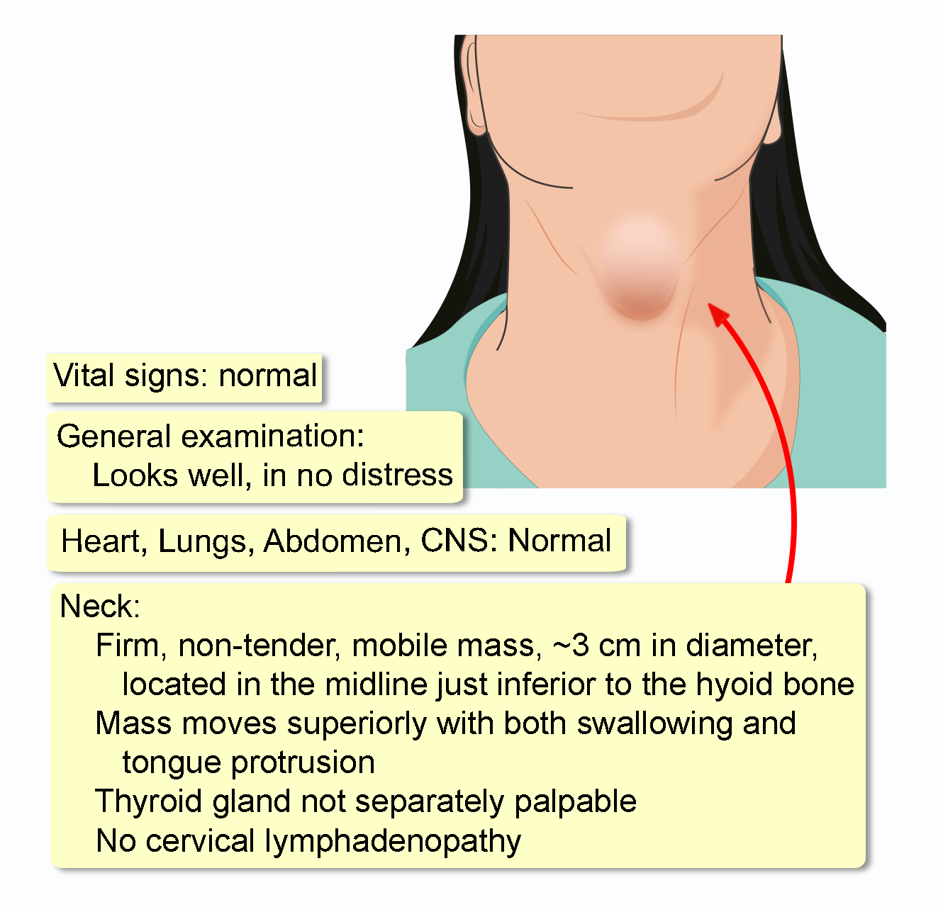 A 25-year-old woman presents to her primary care physician with a neck lump she first noticed six months ago. She reports it has been slowly growing but seemed to increase in size more rapidly over the past two months. It is painless, but she occasionally has a mild foreign body sensation in her throat. She denies any dysphagia, odynophagia, hoarseness, fever, or chills. Her past medical history is unremarkable, and she takes no regular medications. She does not smoke cigarettes and drinks alcohol socially. Her family history is non-contributory for thyroid disease or malignancy.