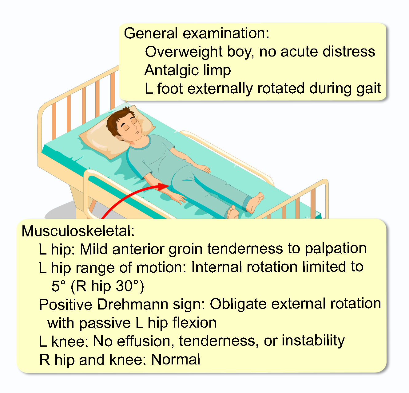 A 13-year-old boy presents to his primary care physician with a four-week history of a limp and intermittent, dull pain in his left knee and groin. The pain is worse at the end of the day and after playing sports. His mother notes that he seems to be walking with his left foot turned outwards. There is no history of significant trauma. He is otherwise healthy, with his growth charts indicating he is at the 96th percentile for weight. His past medical history and family history are unremarkable. His vital signs are normal.