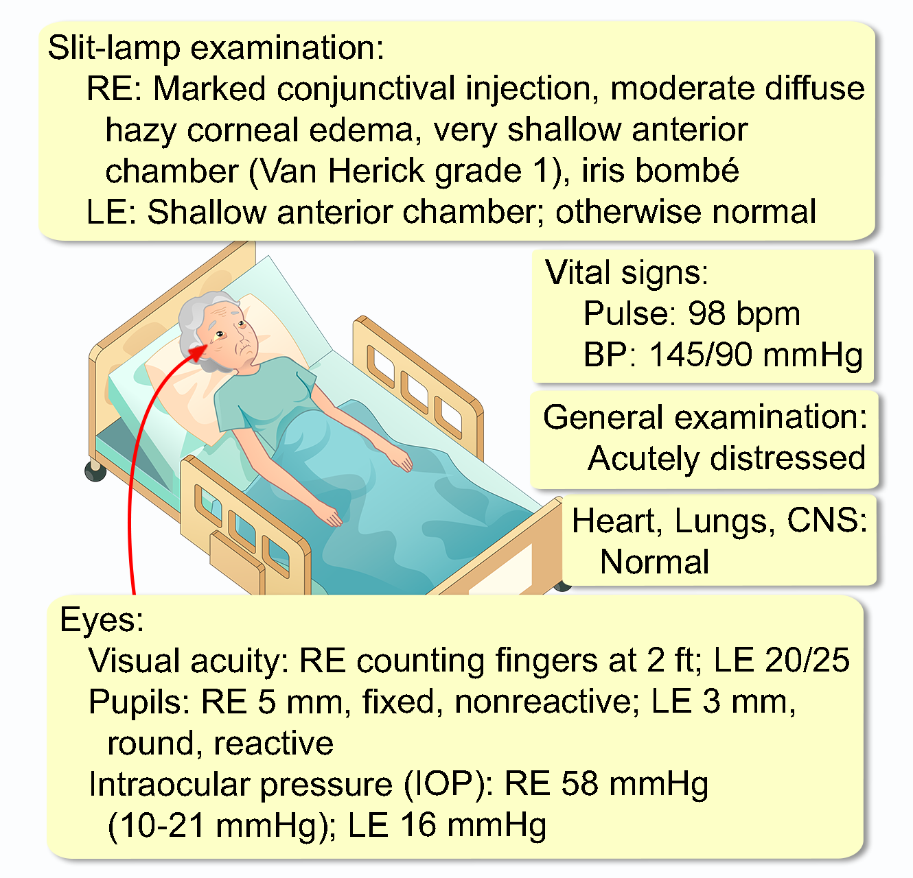A 64-year-old Asian woman presents to the emergency department with a 3-hour history of sudden, severe pain in her right eye. The pain is excruciating, rated 10/10. She also has blurred vision and sees colored halos around lights. These symptoms are associated with a headache and nausea. She reports taking an over-the-counter cold medication for the past 2 days. Her past medical history is notable for hypermetropia, for which she uses reading glasses. She has no history of eye surgery or trauma. She denies allergies to medications.