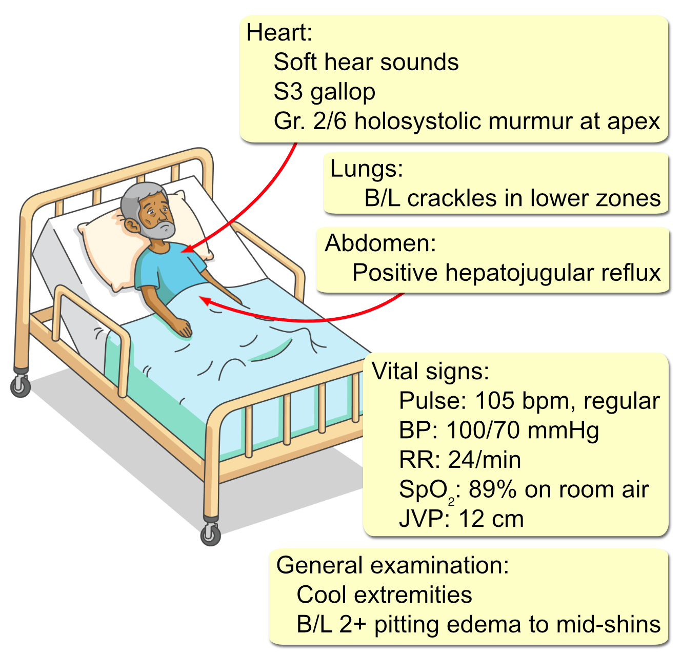 A 68-year-old man with a history of heart failure presents to the emergency department with 5 days of worsening shortness of breath. He now feels breathless even at rest and reports needing three pillows to sleep, up from his usual one. He has also been waking up at night gasping for air. His ankles are markedly more swollen than usual. He admits he has not been taking his prescribed diuretic for the past week and has been eating high-sodium takeout meals frequently. He denies chest pain, fever, or cough. His medical history is significant for ischemic cardiomyopathy with a left ventricular ejection fraction of 35%, diagnosed after a myocardial infarction 6 years ago. He also has hypertension and stage III chronic kidney disease. His home medications include lisinopril, metoprolol succinate, spironolactone, and furosemide. Initial laboratory studies are as follows: